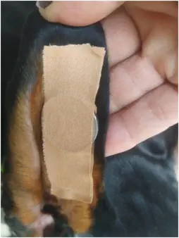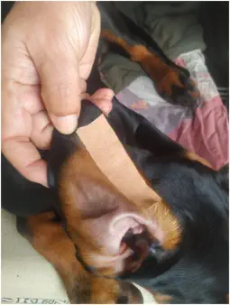 Als dritten Schritt klebt man ein Pflasterstück an den vorderen Ohrrand in das Ohr, so wie im Foto zu sehen.